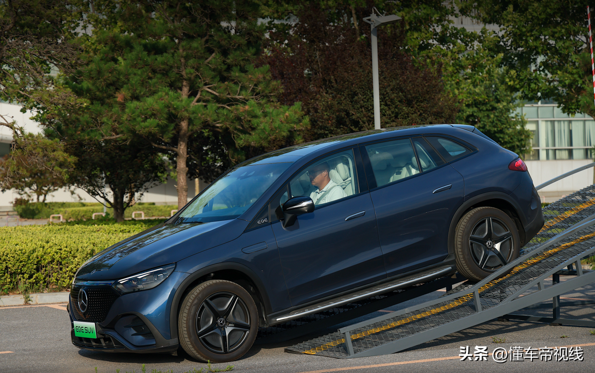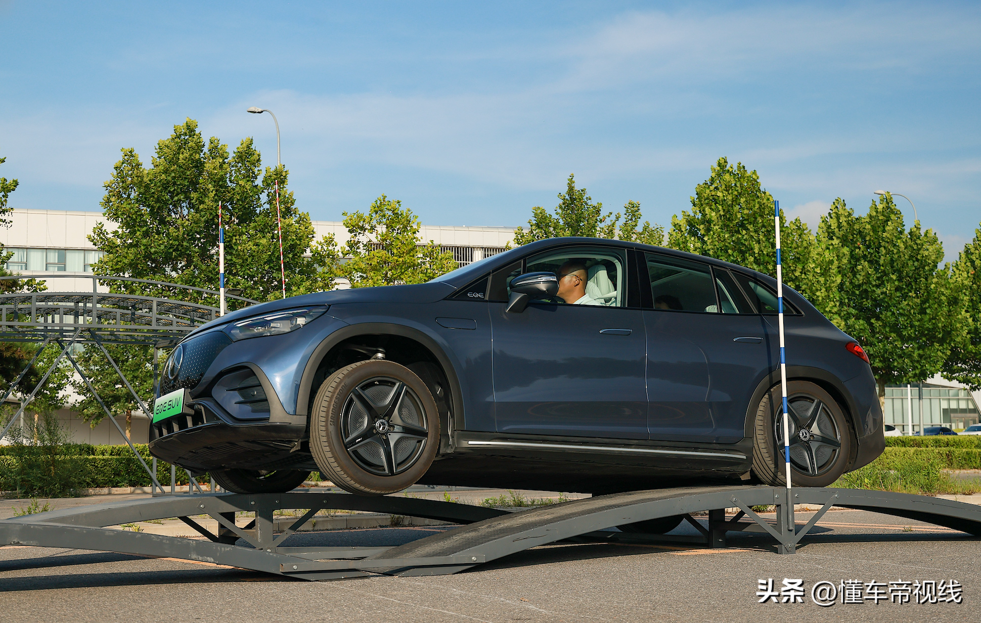 EQE SUV全系標配4MATIC四驅系統,在滑輪組、駝峰路等測試項目中,可以輕松地脫困。尤其在駝峰路項目上,車輛在單側懸空后,重心轉移平緩,動力也能夠快速地分配給有附著力的輪胎,場地的越野教具對EQE SUV并不能構成“挑戰”。