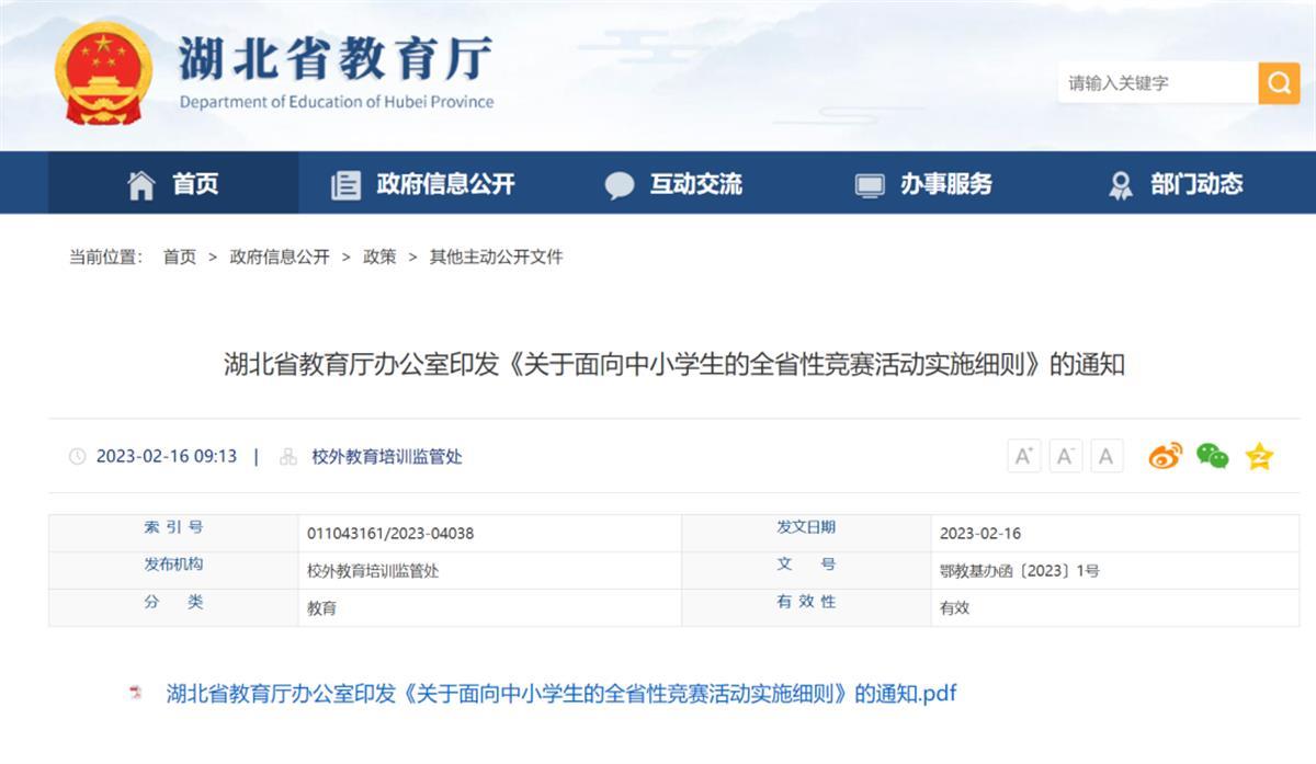 導讀極目新聞記者 肖楊通訊員 梁煒2月16日,極目新聞記者獲悉,日前湖北省教育廳印發《關于面向中小學生的全省性競賽活動實施細則》,強調競賽活動應堅持公益性原則,競賽以及競賽產生的結果,