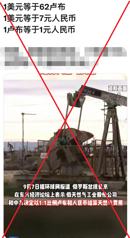 有關說法提及環球網報道。經核查,9月7日,環球網確實發表了題為《普京:俄氣和中國合作伙伴將用盧布和人民幣結算天然氣費用,比例50:50》的文章。此文援引俄羅斯衛星通訊社消息稱:“俄總統普京當地時間7日表示,俄羅斯天然氣工業股份公司(俄氣公司)和中國合作伙伴已決定以盧布和人民幣50:50的比例支付天然氣供應費用。”