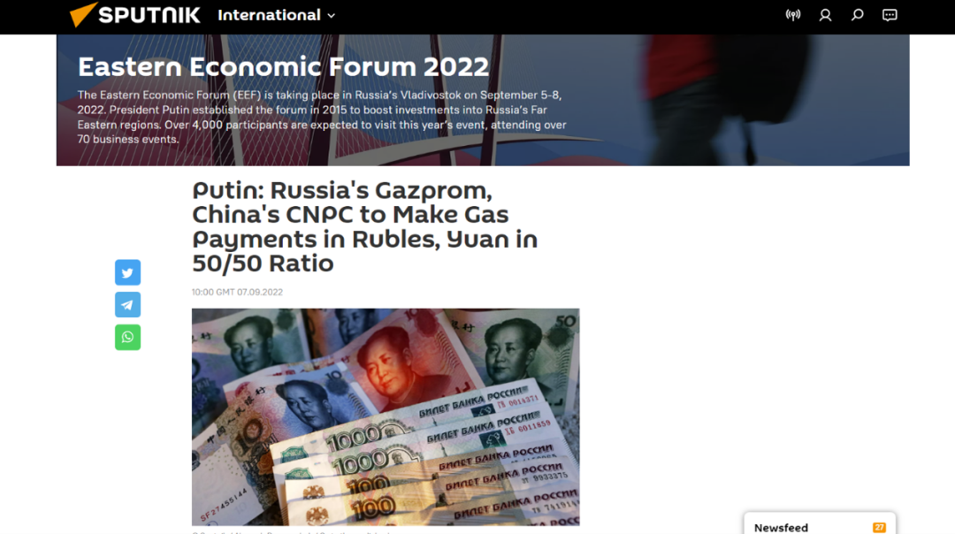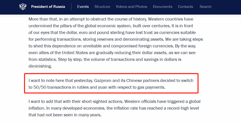 俄羅斯衛星通訊社官網上確有報道能夠印證上述說法。其中提到,俄羅斯的天然氣工業股份有限公司(Gazprom)和中國石油集團(CNPC)已達成協議,將以盧布和人民幣各占50%的比例支付天然氣供應費用。此消息來自普京近日在第七屆東方經濟論壇(EEF)的全體大會上的發言。