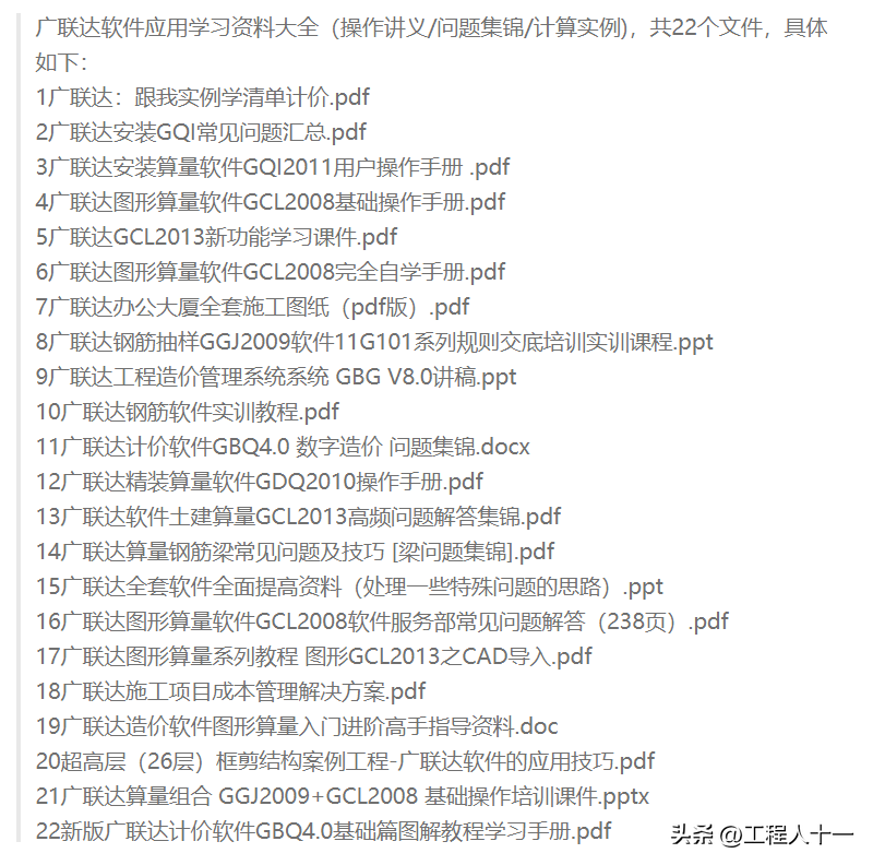 導讀廣聯達軟件完整版學習手冊,操作手冊+教程+問題集錦工程造價電算化軟件廣聯達109個快捷鍵工程造價電算化軟件廣聯達圖形算量軟件GCL2008完全自學手冊內容簡介領取方式文章內容有限,就不一一展示