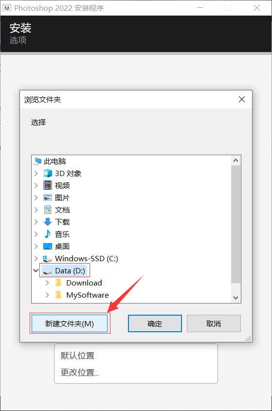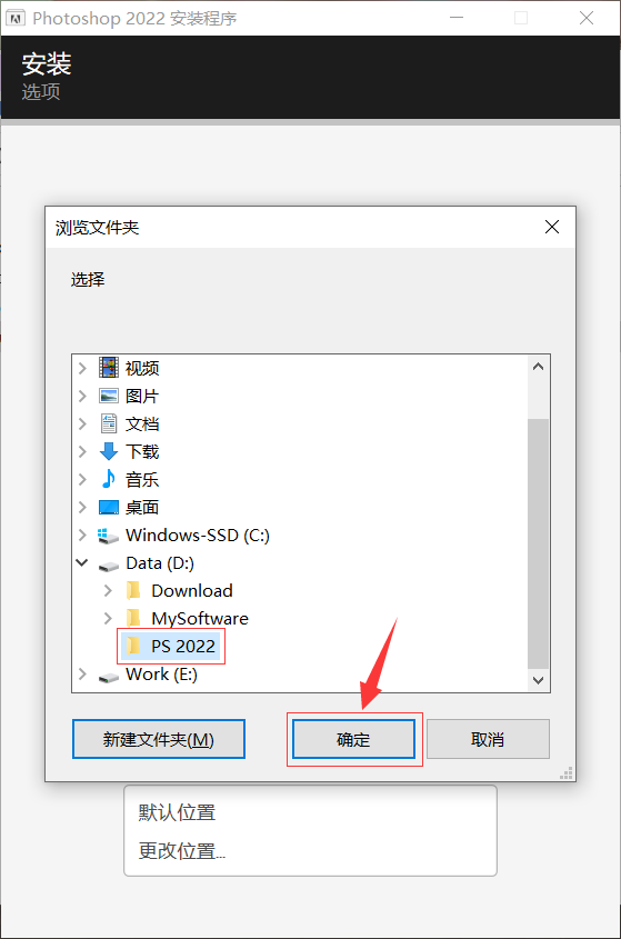 7.將文件夾名稱修改為【PS 2022】,然后點擊確定