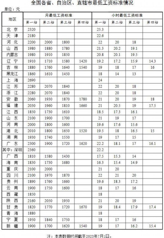 人社部官網近日公布了全國各省、自治區、直轄市最低工資標準情況(截至2023年7月1日),其中,剛剛上調最低工資標準的上海,月最低工資標準繼續穩居全國首位。
