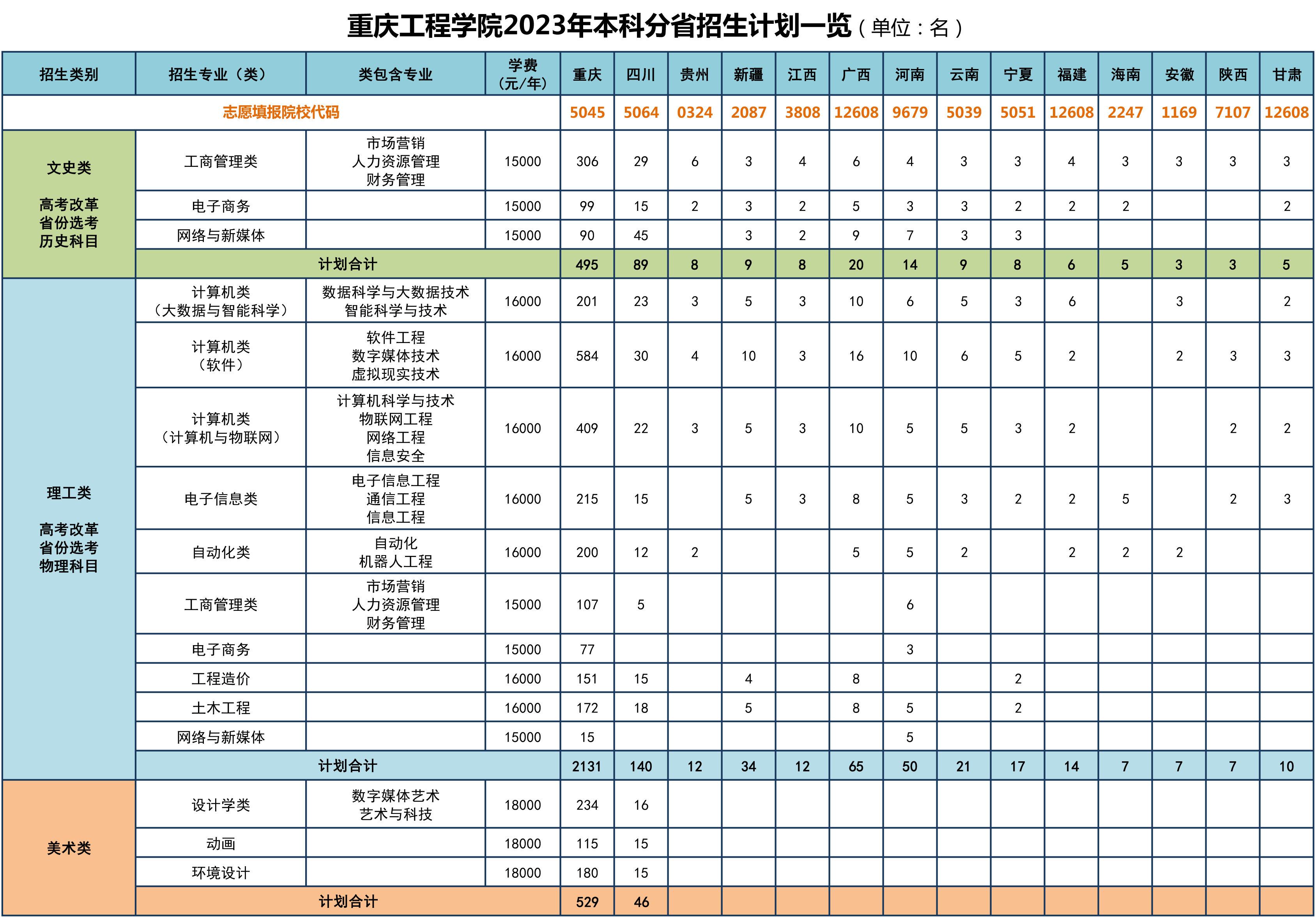 重慶工程學院2023年在四川計劃招生275人,其中文史類495人、理工類140人、美術類46人。