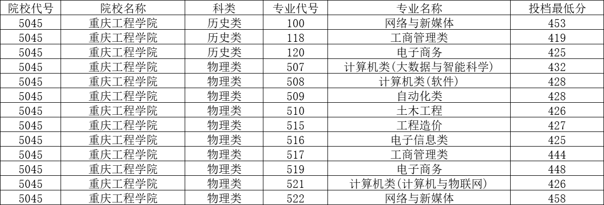 重慶工程學院2022年在重慶各專業投檔最低分