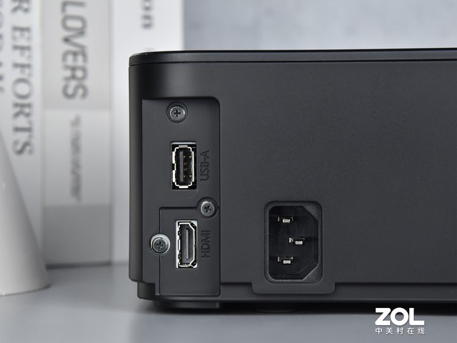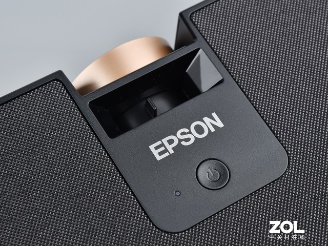 愛普生CH-A100家用投影的外觀采用黑色設計,體積小巧。其整體設計并沒有太多的花哨地方,簡單實用,大氣簡約,鏡頭上金色的涂裝讓產品整體不那么沉悶。