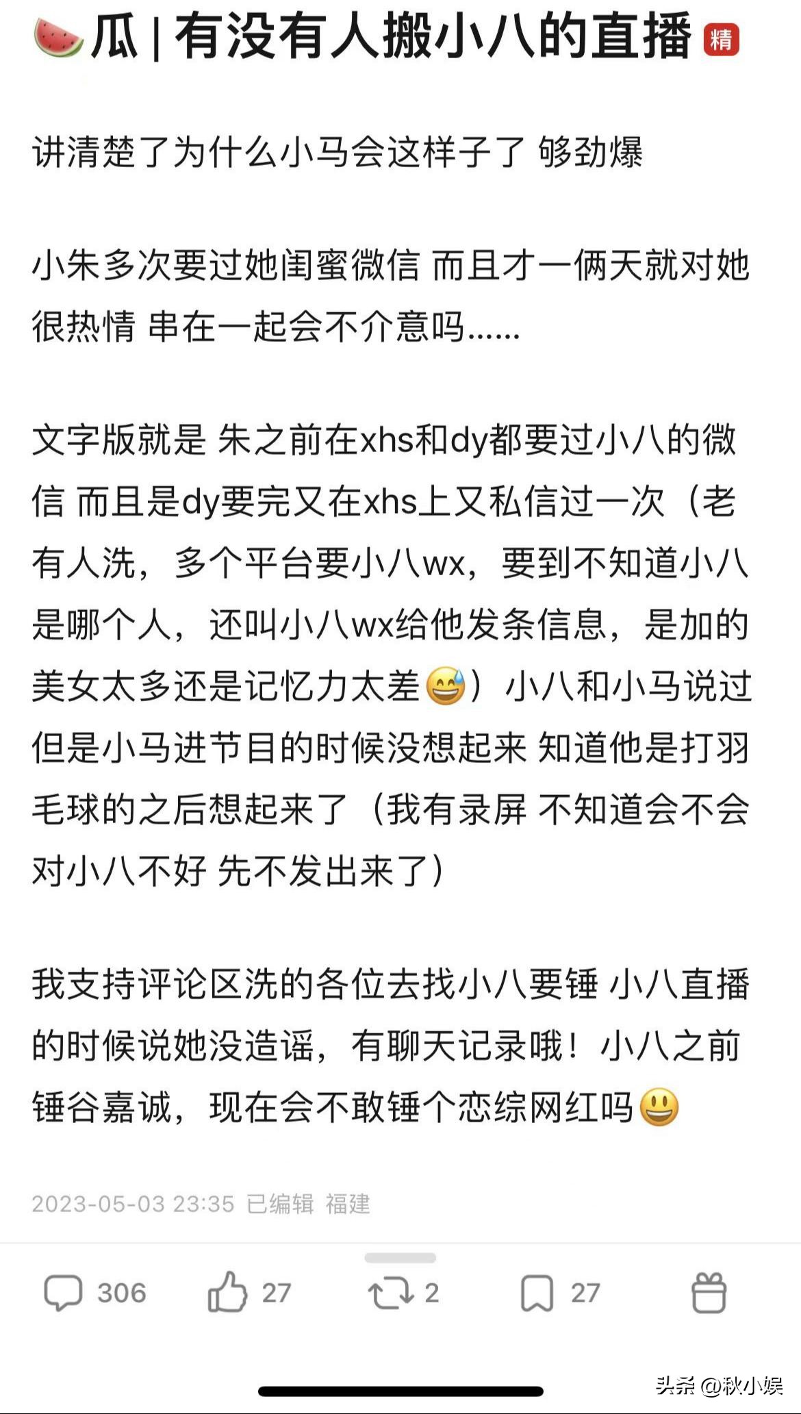 并且小朱在節目中給自己立的深情人設也讓小馬背負了不少罵名。不分青紅皂白的觀眾都覺得小馬是嫌貧愛富見一個愛一個。