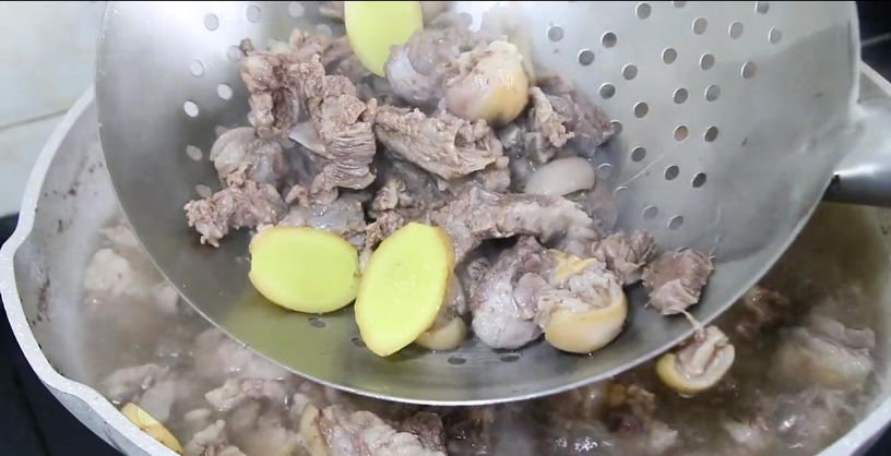 4.等鍋中的水燒開后,先用勺子把漂浮在水面上的浮沫撇出來,然后把焯過水的羊肉用漏勺撈出來放進溫水里清洗一下,將羊肉表面殘留的浮沫和雜質全部清潔干凈后,撈出來放進漏盆里備用。