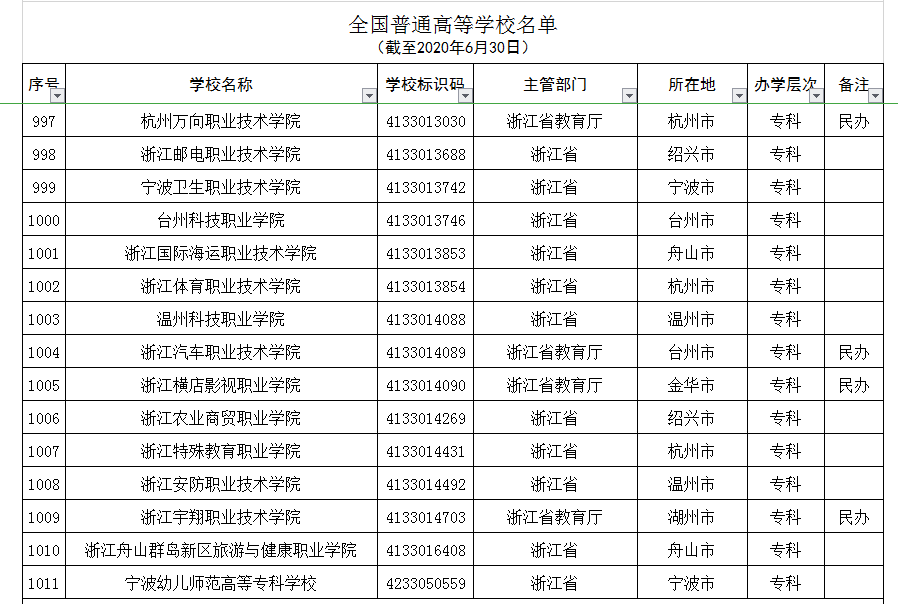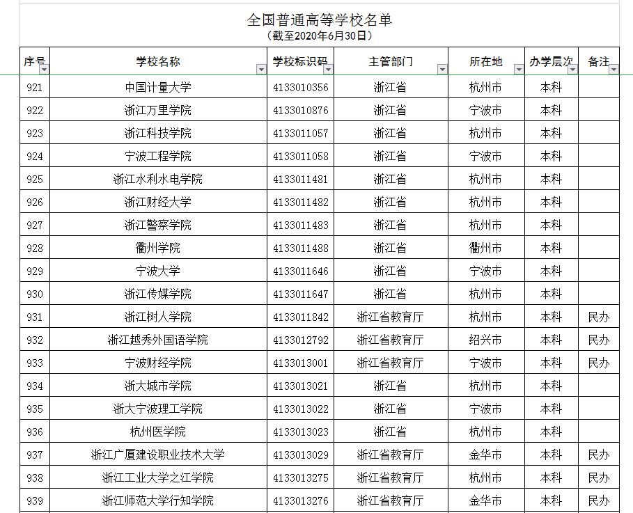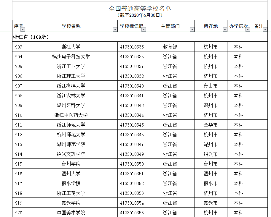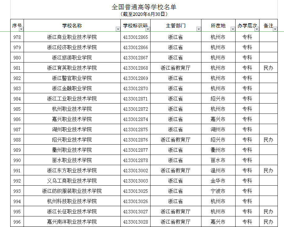 至2020年6月30日,教育部公布的2740所全國普通高等學校中,浙江省有109所: