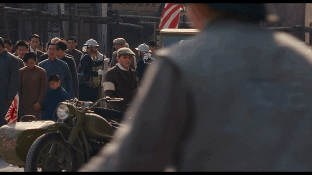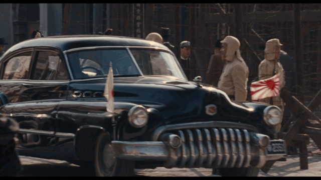 王佳芝乘坐易先生安排的前面插有日本國旗的汽車出行,這在當時是絕大多數人的特權,可以在街上通行。