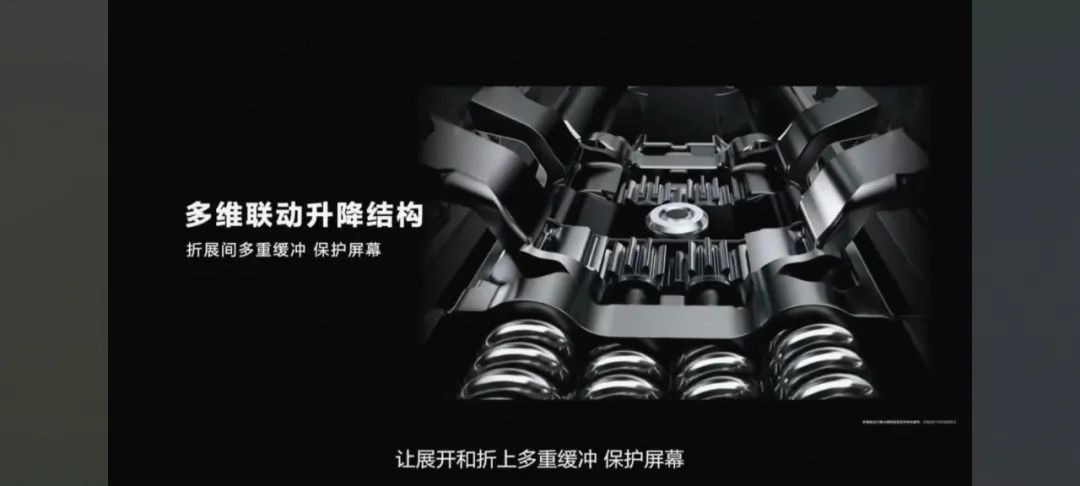 折疊方案上,華為Pocket S采用多維聯動升降水滴鉸鏈,在彎折處形成一個水滴式的容屏空間,水滴式的鉸鏈設計巧妙解決了折疊狀態下的機身縫隙問題,使得折疊后呈現完美無縫和極致纖薄形態。