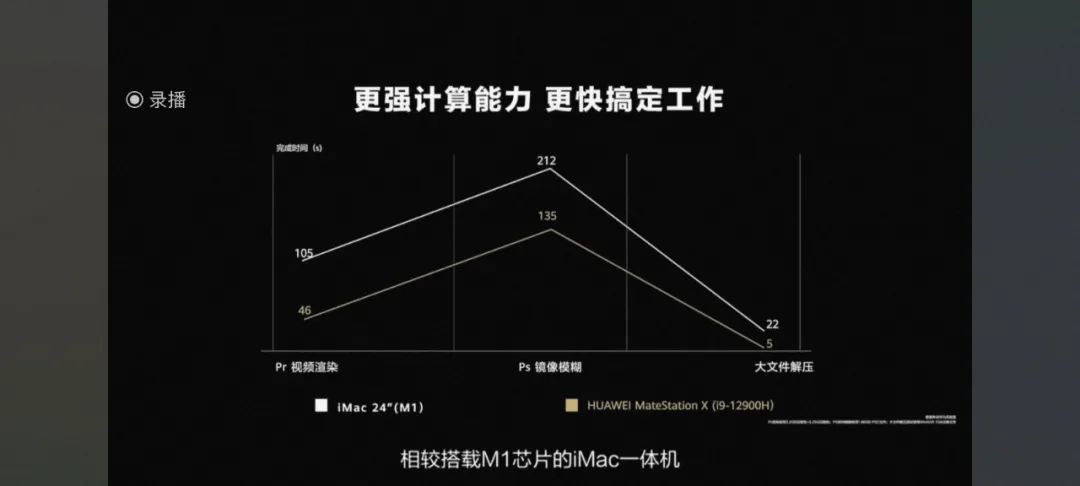 從華為公布數據來看,搭載酷睿i9的新MateStation X,對比M1處理器的蘋果24寸iMac,無論是Pr視頻渲染、PS鏡像模糊還是大文件解壓,都明顯提速。