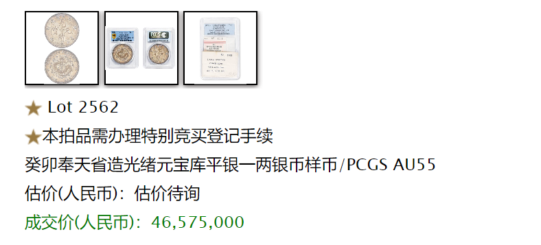 從我們有記錄的光緒元寶成交來看,我們目前市場上面成交價值最高的一枚的光緒元寶是“1903年癸卯奉天省造光緒元寶庫平銀一兩銀幣樣幣”去年成交價是46,575,000元,這枚錢幣不是第一次出現在我們視野里面,以前就有拍賣過很多次,而且有關于它的資料也是非常多的,我們對于這種錢幣來說也是只能在資料里面了解,因為它是屬于孤品級別的存在。我們不用過多的考慮它的價值。畢竟我們也不可能擁有。