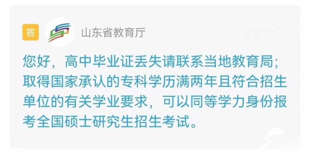 山東省教育廳進行了回復:高中畢業證丟失請聯系當地教育局;取得國家承認的專科學歷滿兩年且符合招生單位的有關學業要求,可以同等學力身份報考全國碩士研究生招生考試。