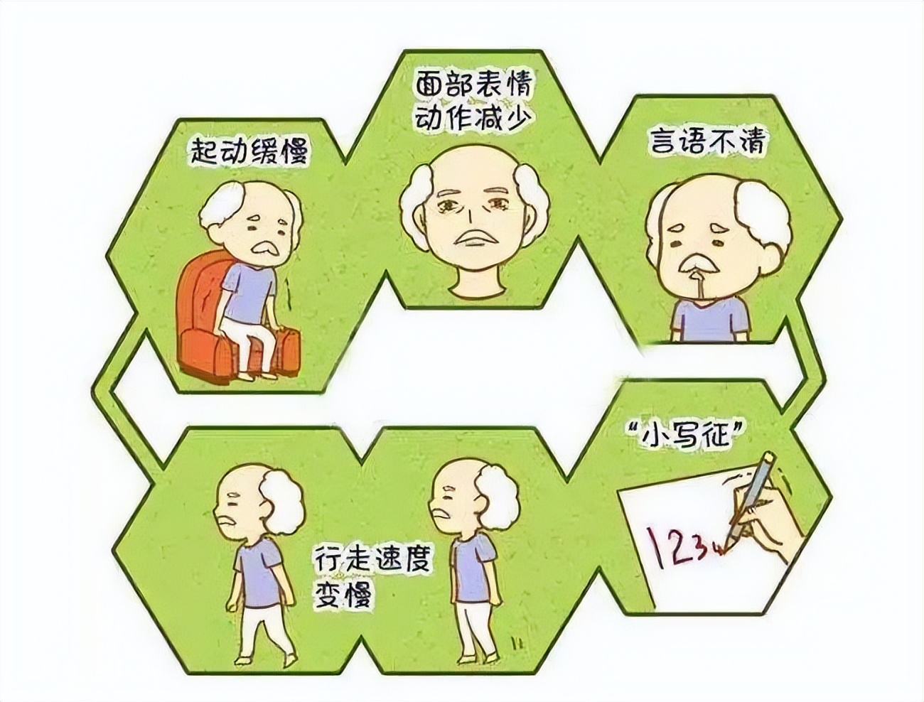 3.慢即“運動遲緩”,日常生活中穿衣、刷牙、洗臉等動作變慢,寫字困難,筆跡彎曲,越寫越小,醫學上稱為“小寫癥”。行走時起步困難,一旦邁步,身體前傾,重心前移,步伐小而越走越快,不能及時止步,即“慌張步態”。