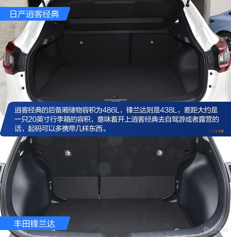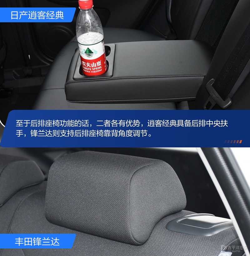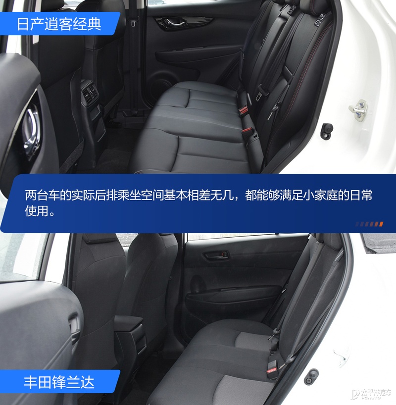 逍客經典的車身長寬高分別為4401/1837/1593mm,軸距2646mm;鋒蘭達的車身長寬高分別為4485/1825/1620mm,軸距2640mm。兩臺車的體型比較接近,實際空間表現也差不多在同一水平,但逍客經典得益于座椅更加給力,所以乘坐舒適性明顯更勝一籌。