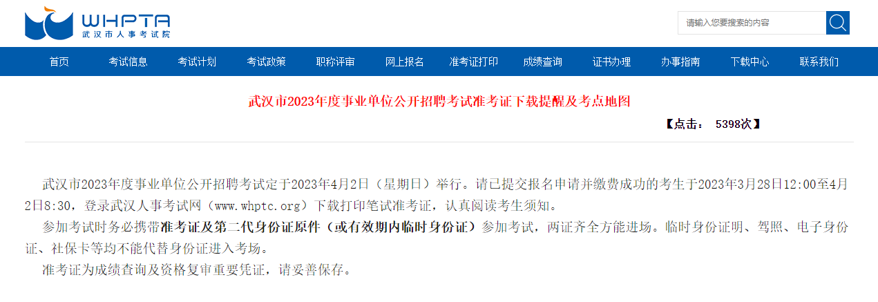 武漢市2023年度事業單位公開招聘考試定于2023年4月2日(星期日)舉行。請已提交報名申請并繳費成功的考生于2023年3月28日12:00至4月2日8:30,登錄武漢人事考試網(www.whptc.org)下載打印筆試準考證,認真閱讀考生須知。