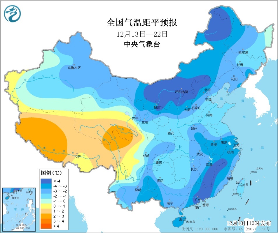 未來10天,冷空氣活動頻繁且勢力較強,除青藏高原氣溫偏高2℃左右外,我國大部地區平均氣溫較常年同期持續明顯偏低,其中新疆、內蒙古、江南東部、華南等地偏低2~4℃,局地偏低5℃以上。