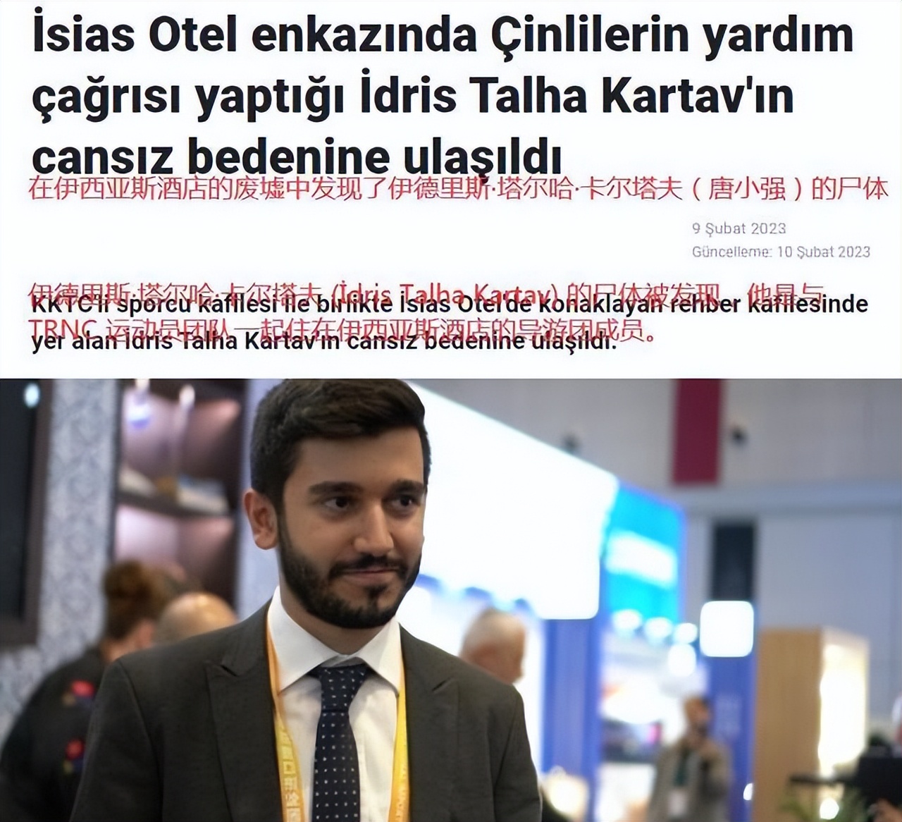 2月10日凌晨,據土耳其媒體報道,在土耳其地震中坍塌的阿德亞曼西亞酒店的救援工作傳來噩耗,經過89個小時的救援后,救援人員找到了包括唐小強(Idris Talha Kartav)在內的10人的尸體,唐小強去世的消息得到了土耳其旅游指南商會聯盟 (TUREB) 的證實。