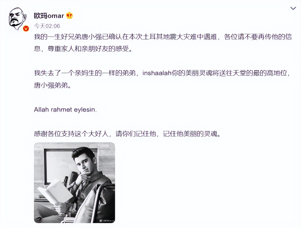 唐小強的好友歐瑪也發文公布噩耗,證實了唐小強在地震中遇難,并曬出了唐小強生前的照片,表達哀悼。