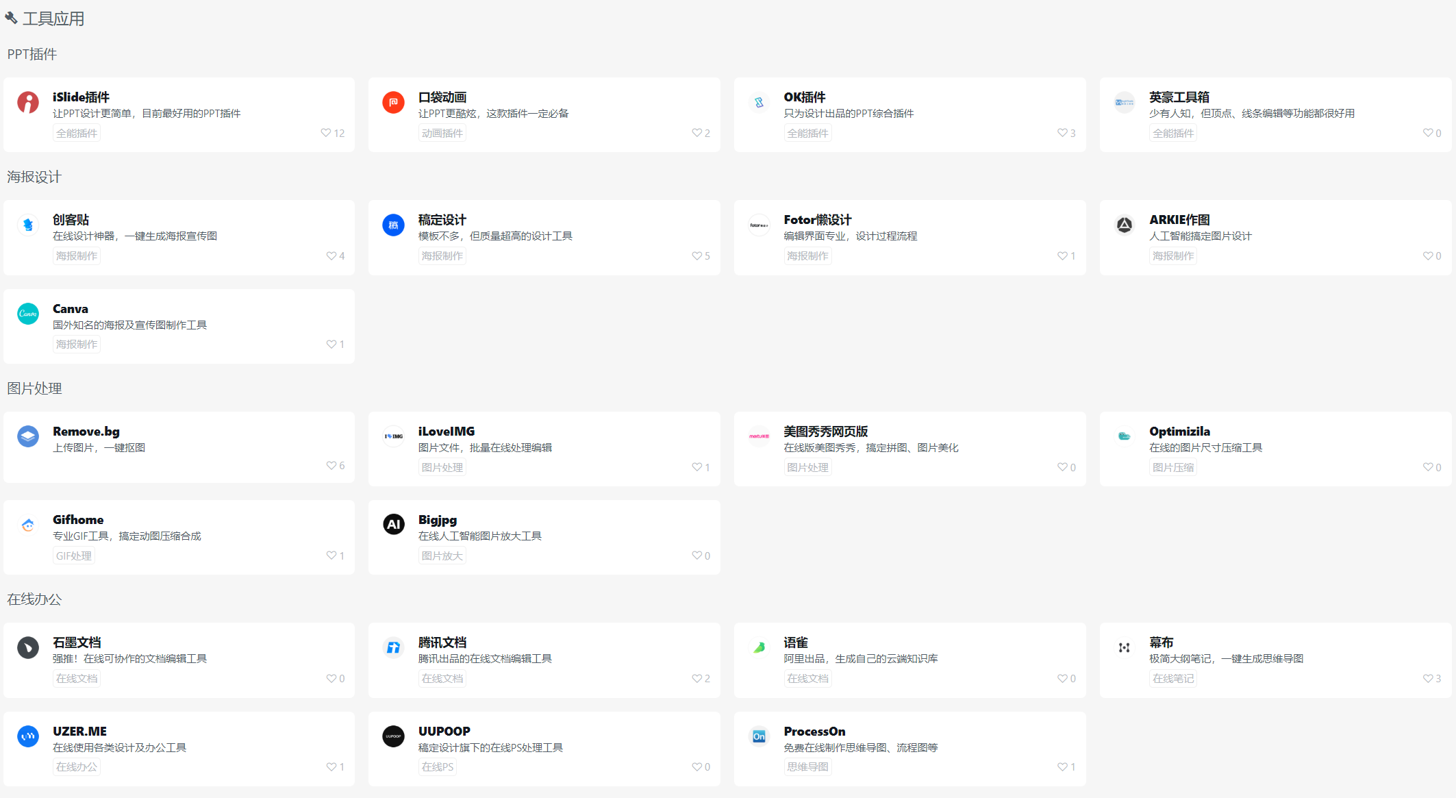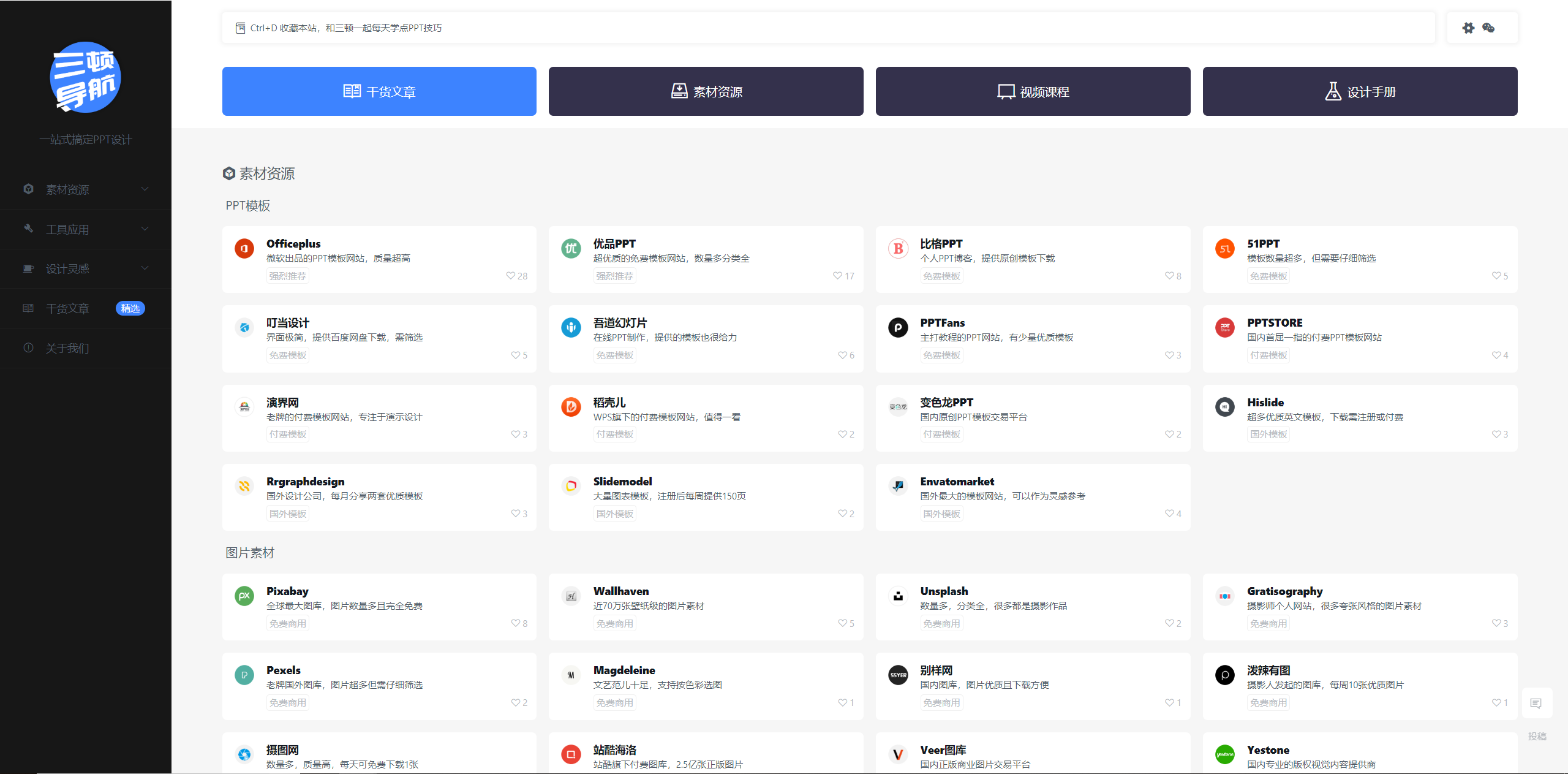 推薦它的最大理由是內容全、覆蓋面廣,不管是PPT設計靈感的收集,還是模板、圖片素材等等,都能在這里找到對應的網站。