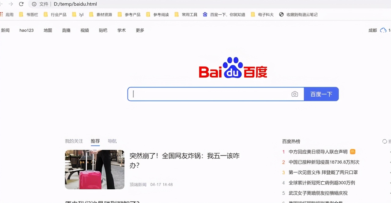 我們把‘Response’里面的內容全部復制下來,保存到本地的一個baiduu.html里面。然后直接打開本地的這個baiduu.html,可以看到完全一樣的效果。(相當于復制了一個百度首頁)
