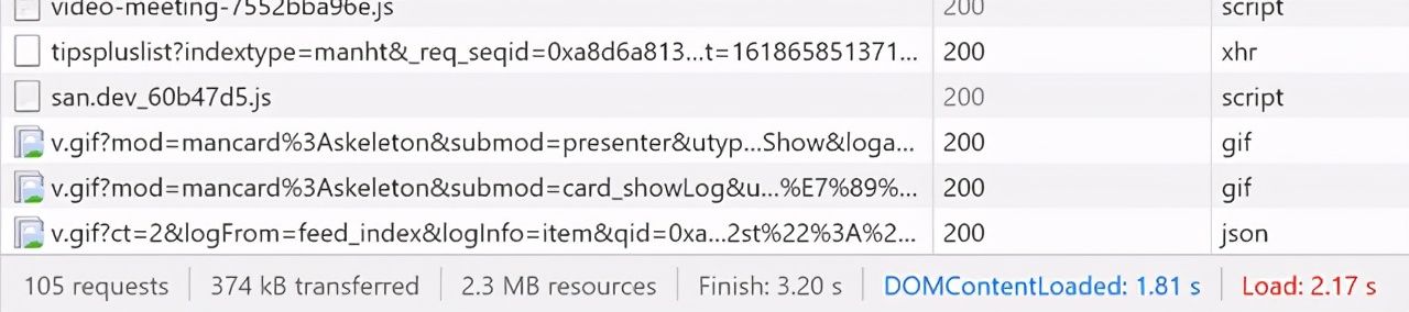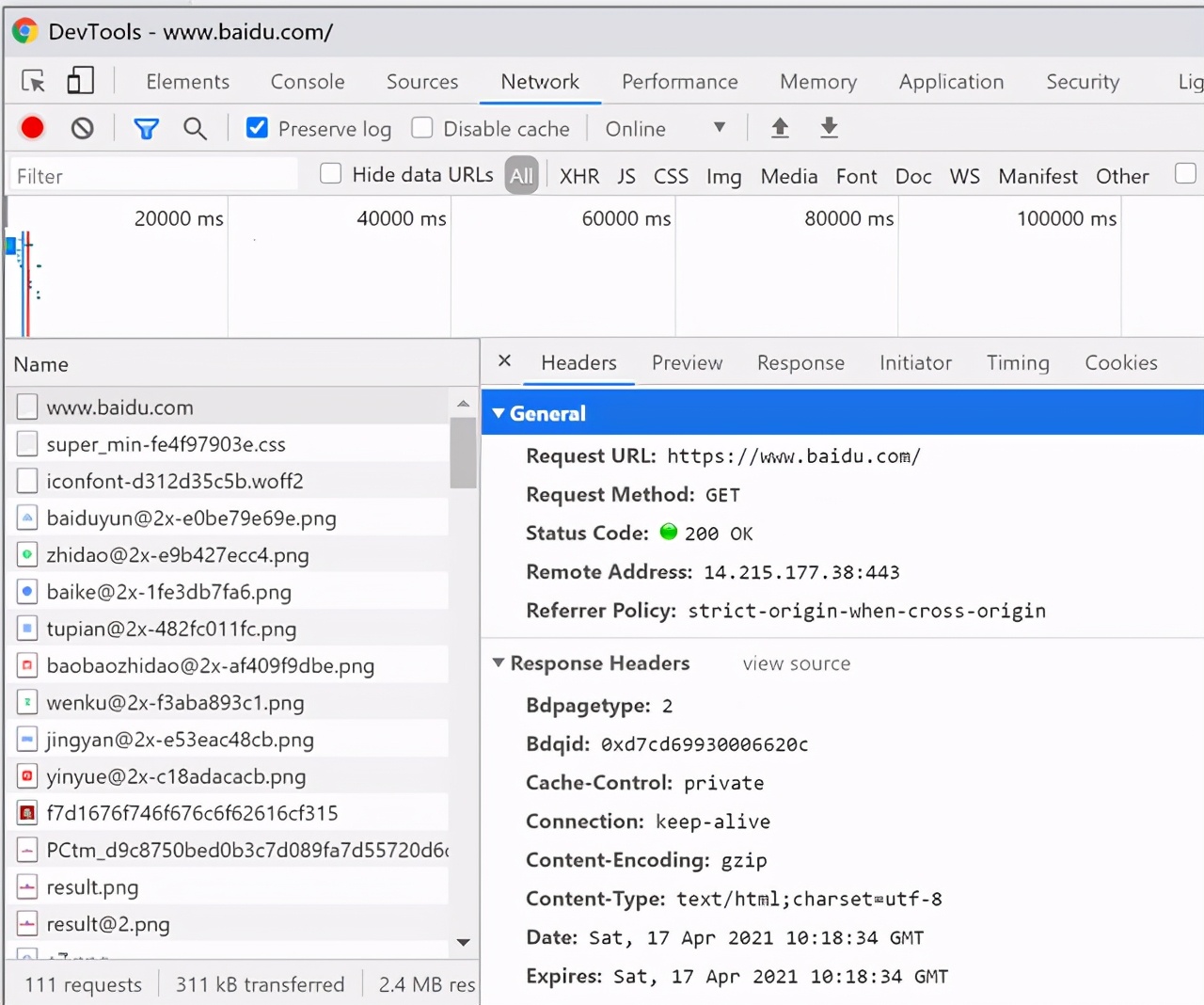 從調試模式的監控結果可以看到一共有105個網絡包,總共2.3MB,3秒左右完成了百度首頁的顯示。