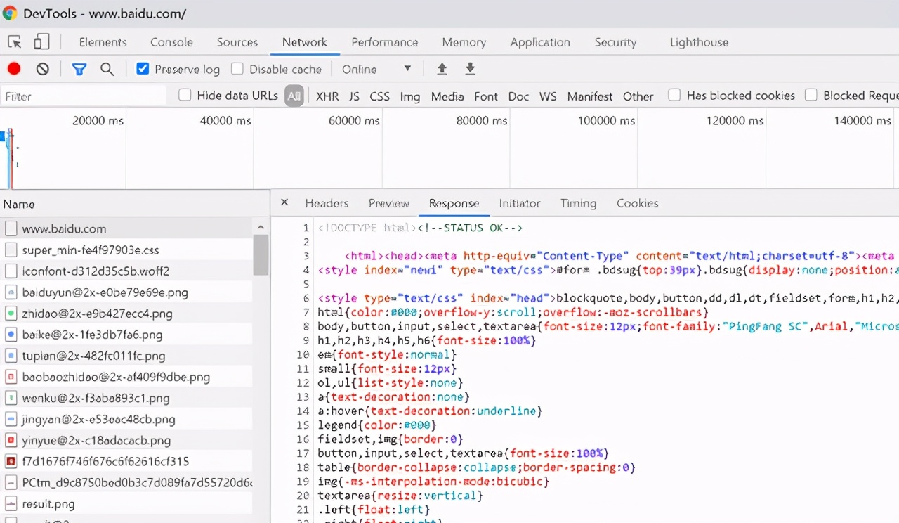 那百度服務器回復了瀏覽器什么呢?切換到‘response’標簽頁,可以看到回復的內容: