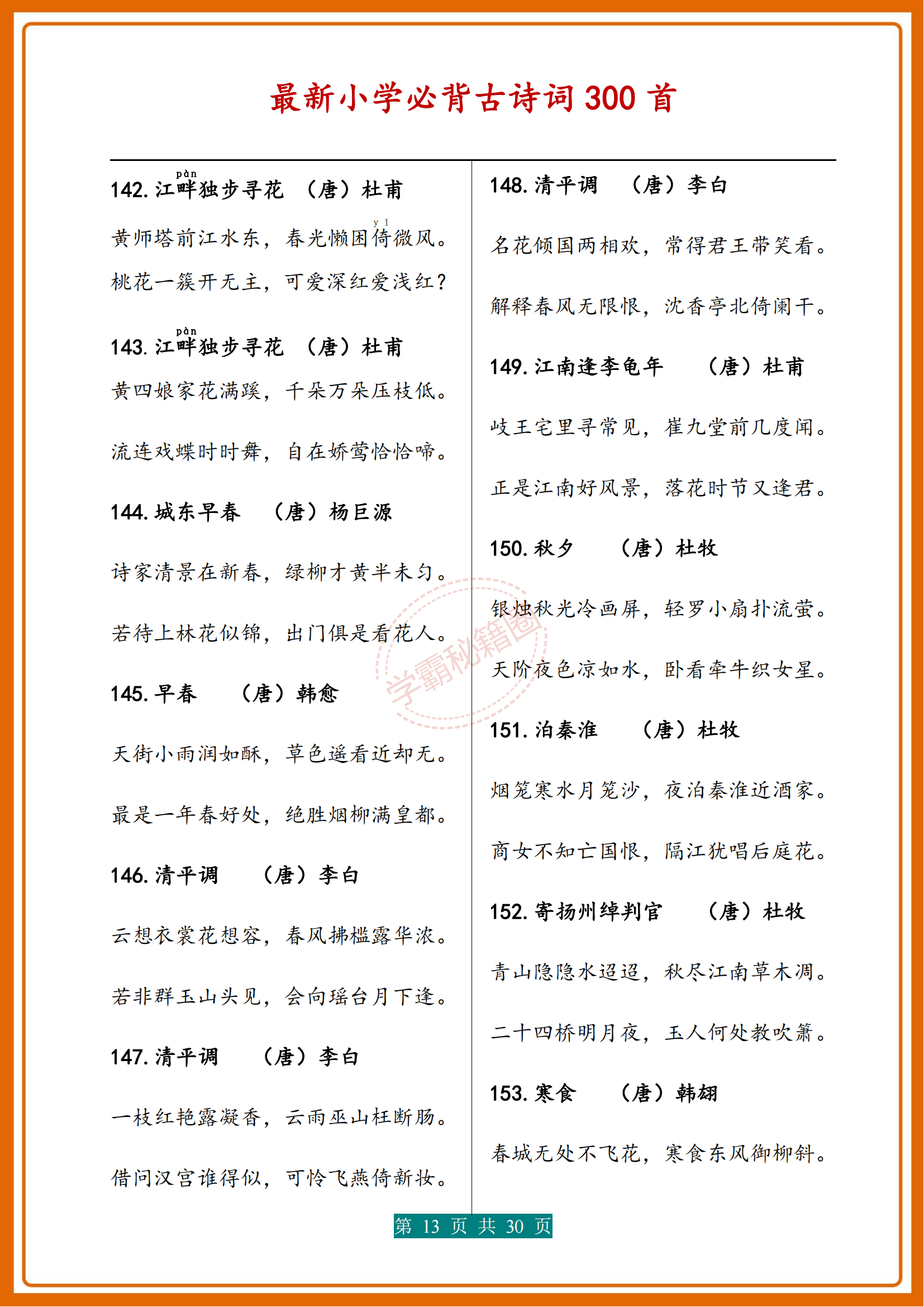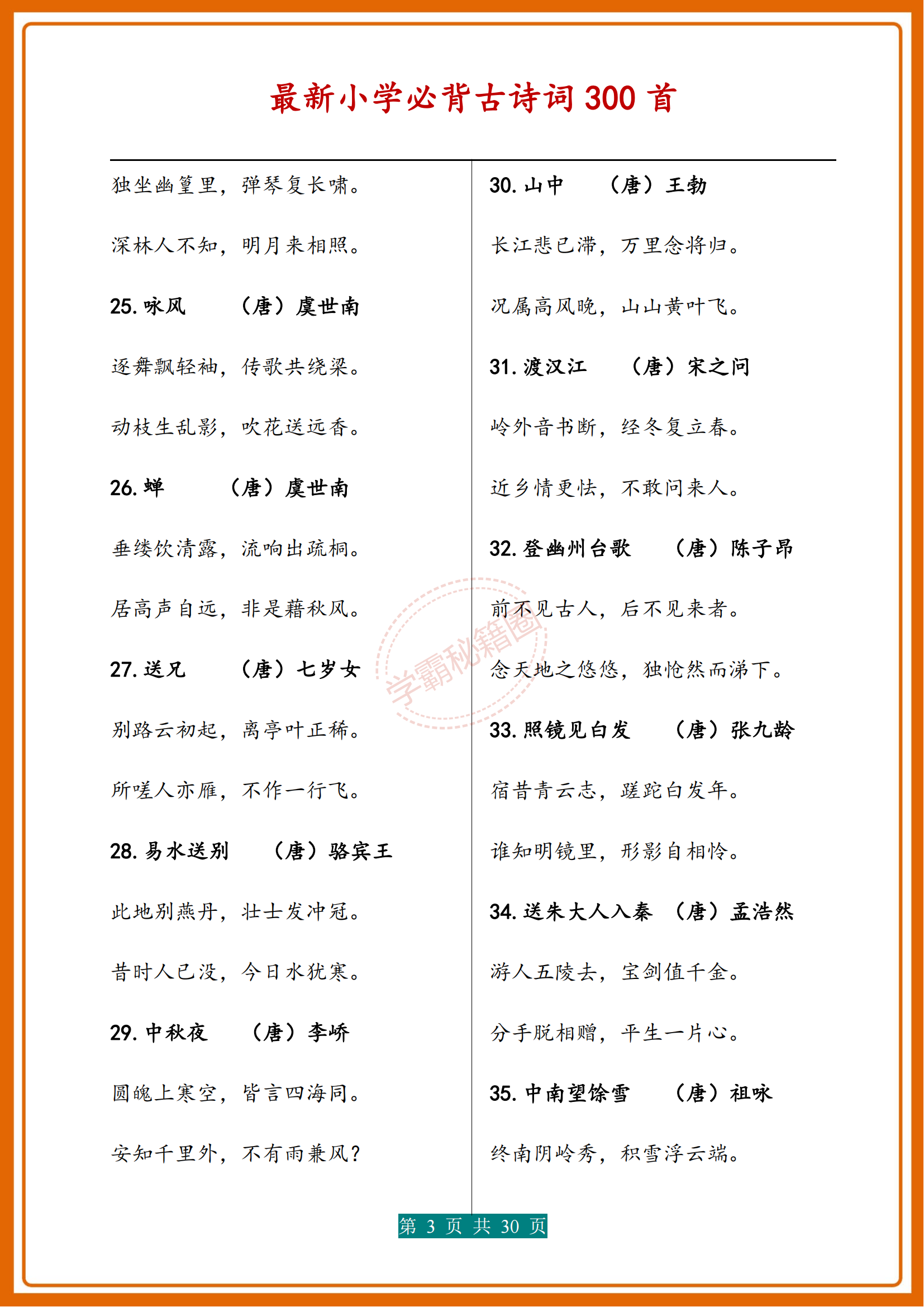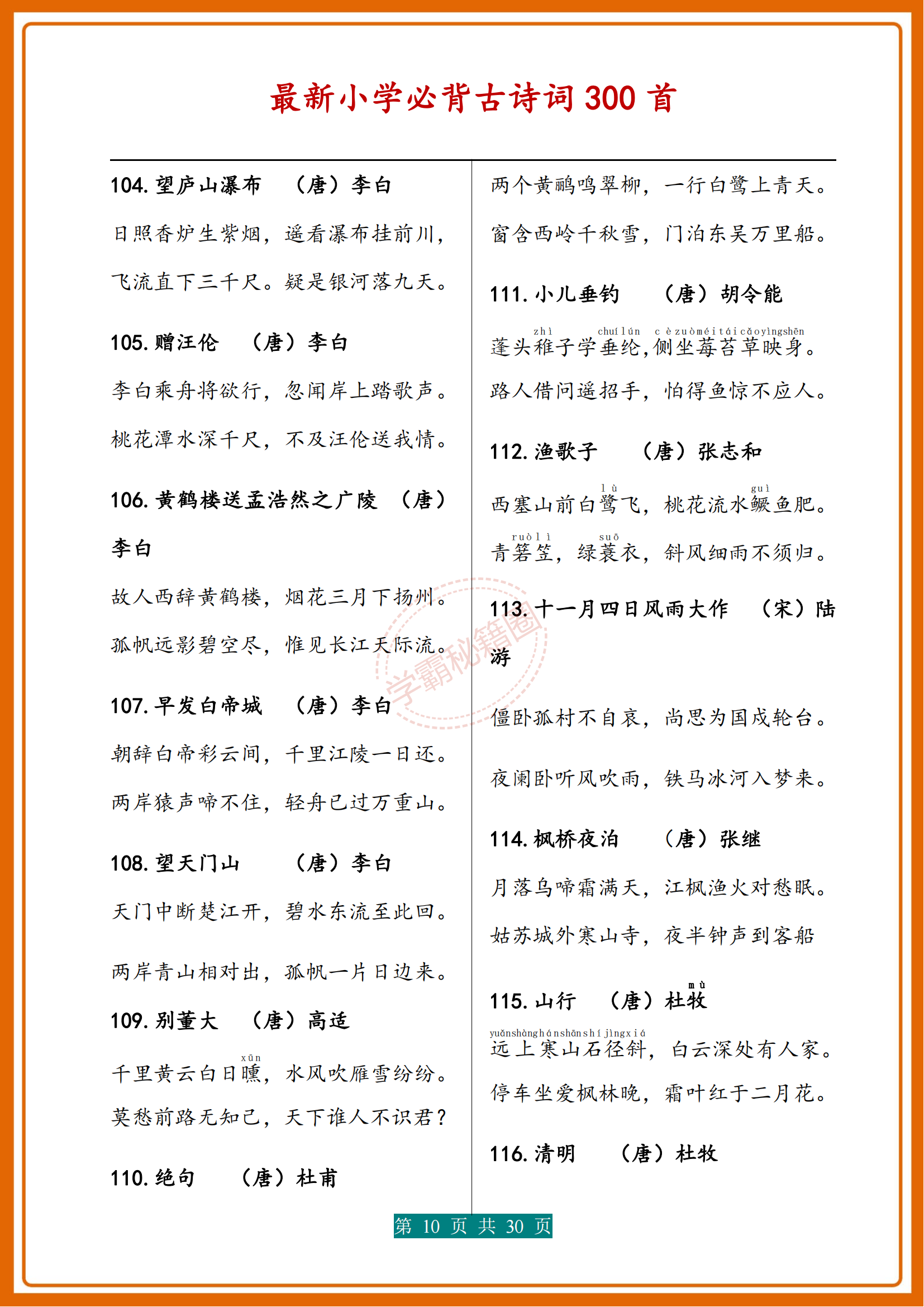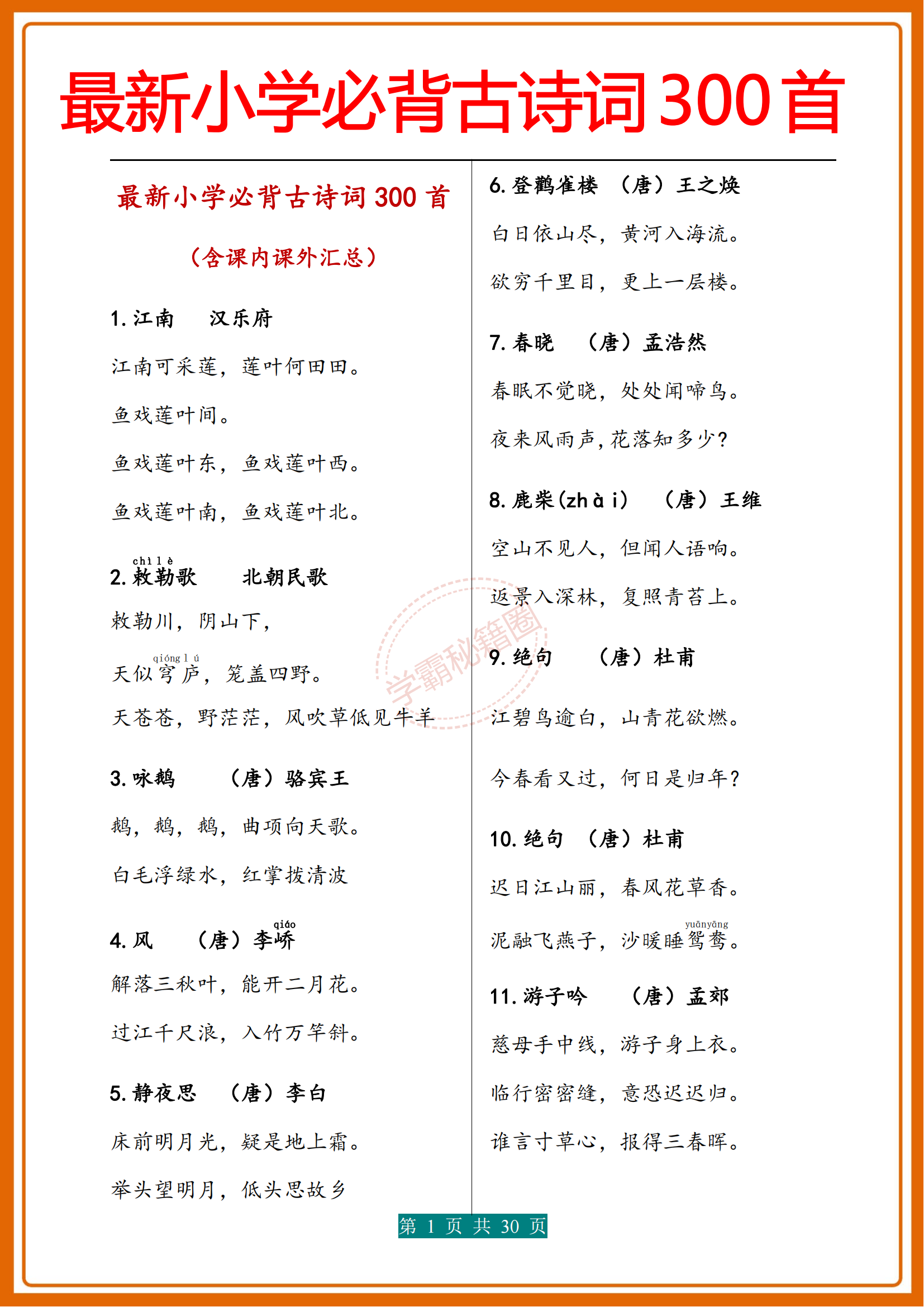人民日報|新版小學1-6年級必背(古詩詞)300首濃縮版30頁,收藏