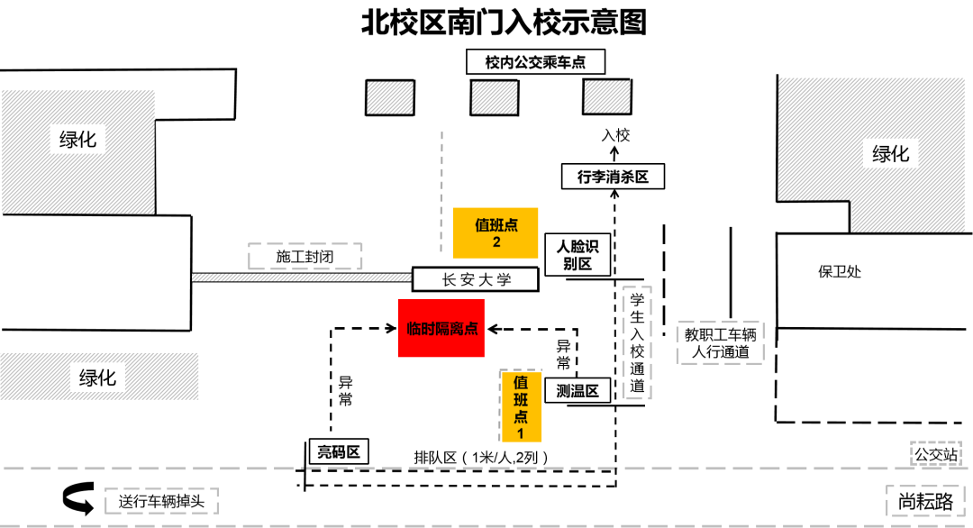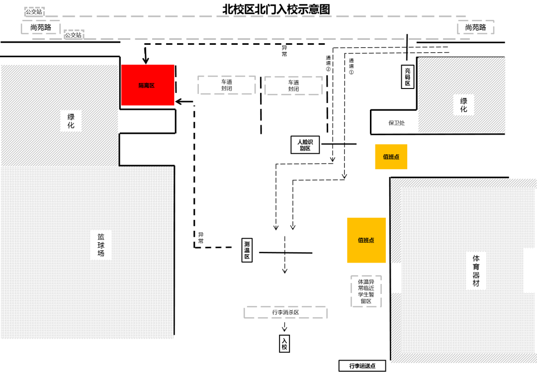 北校區北門環節為亮碼→身份驗證→測溫→行李消殺;