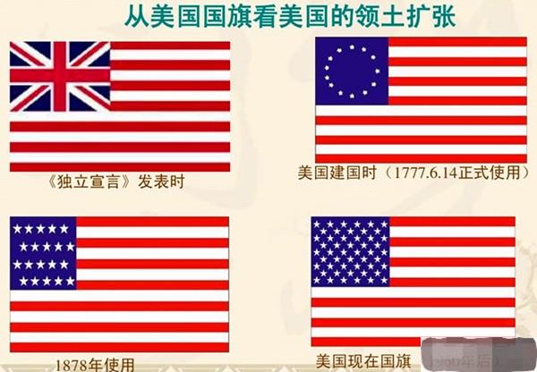 美國國旗“星條旗”記載著美國領土的擴張歷史,美國領土的主要擴張手段是通過武力征服和廉價購買。美國獨立時的國旗中13顆五角星代表13個獨立的殖民地,可以說這面旗代表著83.5萬平方公里的領土,僅為美國現有面積的8.7%。而大部分的領土面積是通過購買而來的,價格之低廉,故事之離奇,簡直就像童話一般。