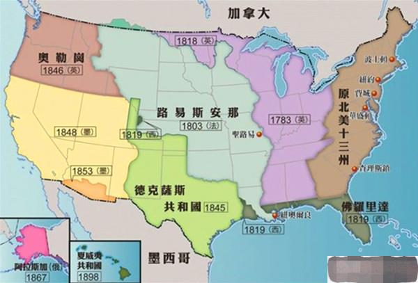 1783年,美英兩國在法國簽訂《巴黎和約》,英國承認美國獨立,并先后把13個州以外大西洋沿岸大部分土地劃歸美國,使美國領土達到230萬平方公里,約為美國現有面積的24%。1789年,美國聯邦政府成立,很快就走上了領土擴張的道路。