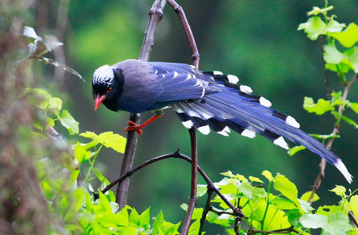 釋槐鳥:又叫紅嘴藍鵲,別稱長山鵲;能發出多種不同的嘈吵叫聲和哨聲。性喧鬧,結小群活動。以果實、小型鳥類及卵、昆蟲為食,常在地面取食。主動圍攻猛禽。