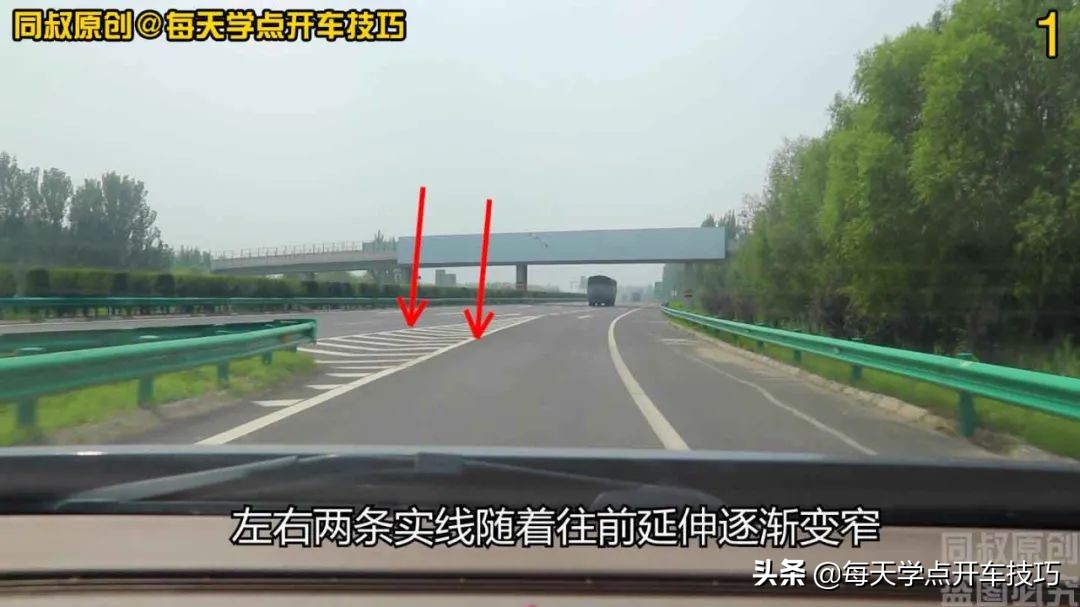 今天我們繼續來認識,高速公路上的標線和標志,以及在看到這些標線和標志的時候如何正確行駛。在匝道與主干道交匯的左手邊這個長三角地帶,左右兩條實線隨著往前延伸逐漸變窄,并相交于前方的虛線位置,