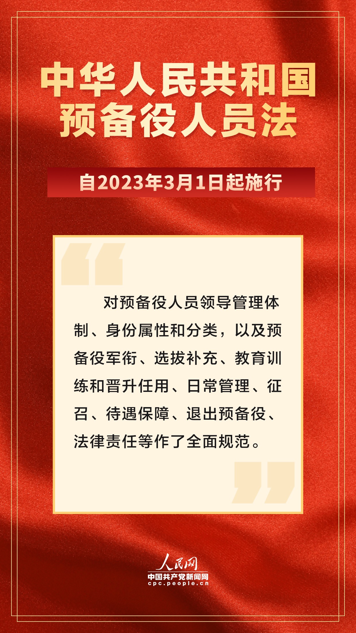 《中華人民共和國預備役人員法》自2023年3月1日起施行,共10章65條,主要對預備役人員領導管理體制、身份屬性和分類,以及預備役軍銜、選拔補充、教育訓練和晉升任用、日常管理、征召、待遇保障、退出預備役、法律責任等作了全面規范。對于加強預備役人員隊伍法治化建設,推進預備役部隊轉型發展具有重要意義。