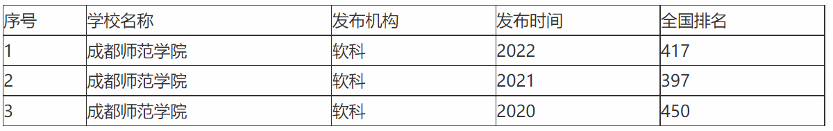 在軟科大學2022排名中,成都師范學院排在417位,相較于2020、2021年位次有所波動。