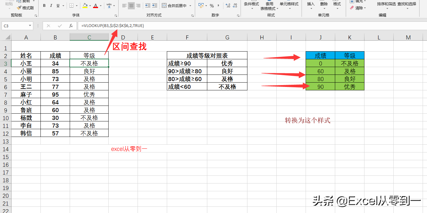 公式:=VLOOKUP(B3,$J$2:$K$6,2,TRUE)