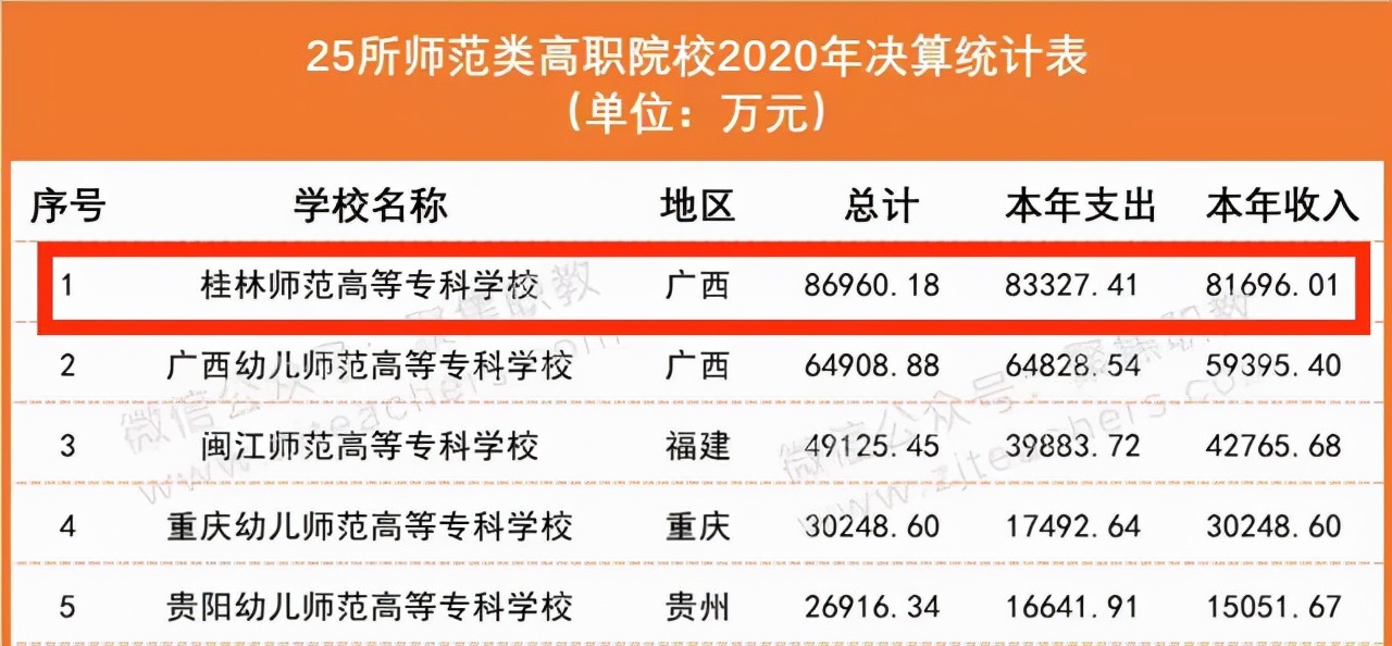 據相關機構發布的消息,在“25所師范類高職院校2020年決算統計表”中,桂林師范高等專科學校以全年收入81696.01萬元,位居第一名,而且該校在“2021年師范專科院校排名”里,位居全國第二名。