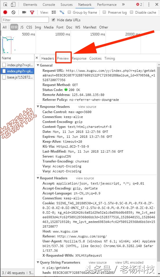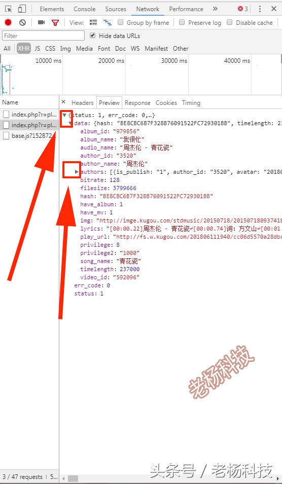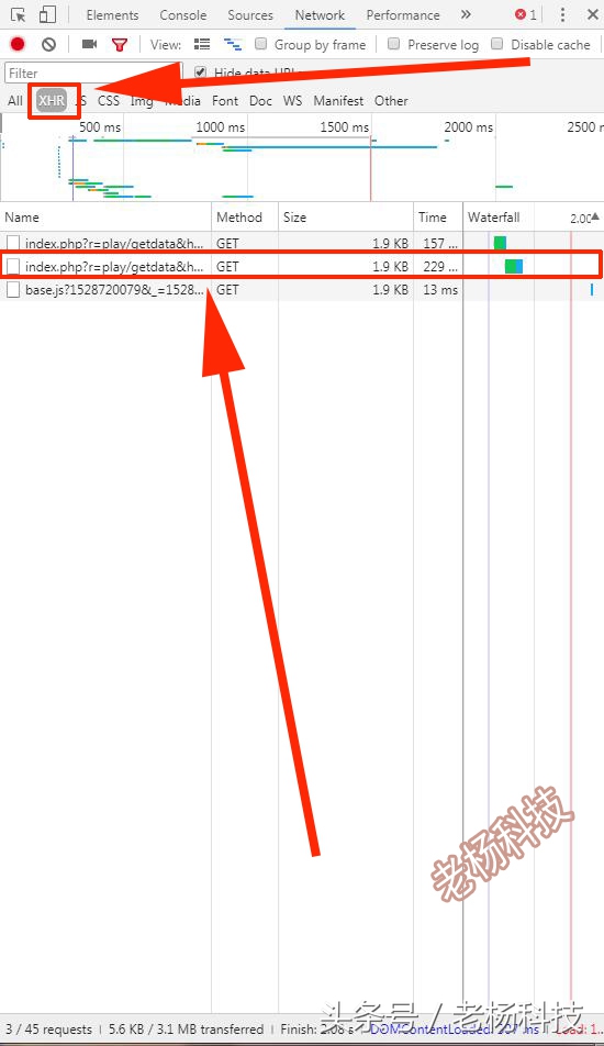 7.接下來,我們先點擊上面紅色框框起來的XHR,然后再點擊下面紅色框框起來的以index開頭的網址。