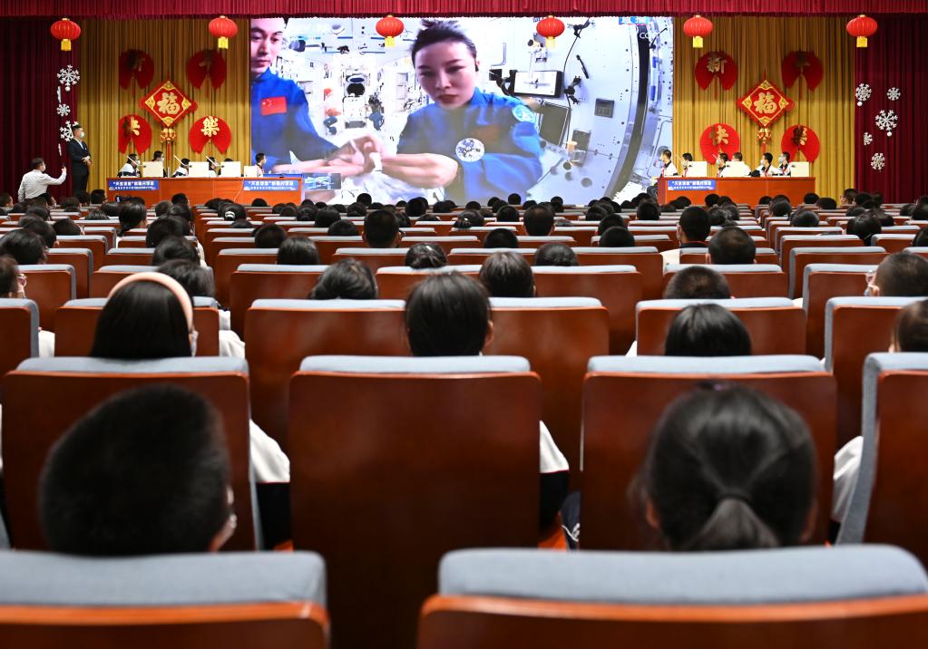 2022年3月23日,在新疆烏魯木齊市第七十中學,學生收看“天宮課堂”第二課。新華社記者郝建偉攝