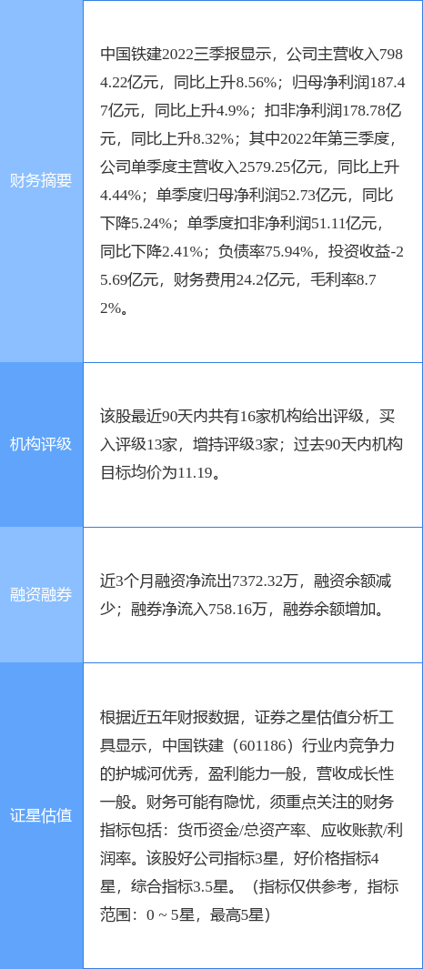 導讀今日中國鐵建漲9.99,收盤報8.7元。2022年10月30日,光大證券研究員孫偉風,馮孟乾發布了對中國鐵建的研報《2022年三季報點評前三季度營收及業績穩健增長,綠色環保業務訂單
