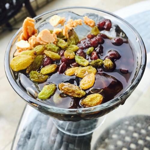 6.制作好的冰粉,向里面加入半勺紅糖水,然后再放入提前切碎的山楂片,表面再撒上少許的葡萄干。就可以食用了。