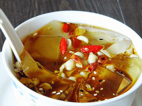 四川冰粉是一道有名的小吃,冰冰涼涼的涼粉在加一份火熱的麻辣燙,其實在是太過癮了。涼粉吃起來q彈爽滑,除了雪糕之外,涼粉可謂是最清涼解暑的佳品了。涼粉作為一道風靡全國的小吃,是地攤上最受歡迎的美食了。