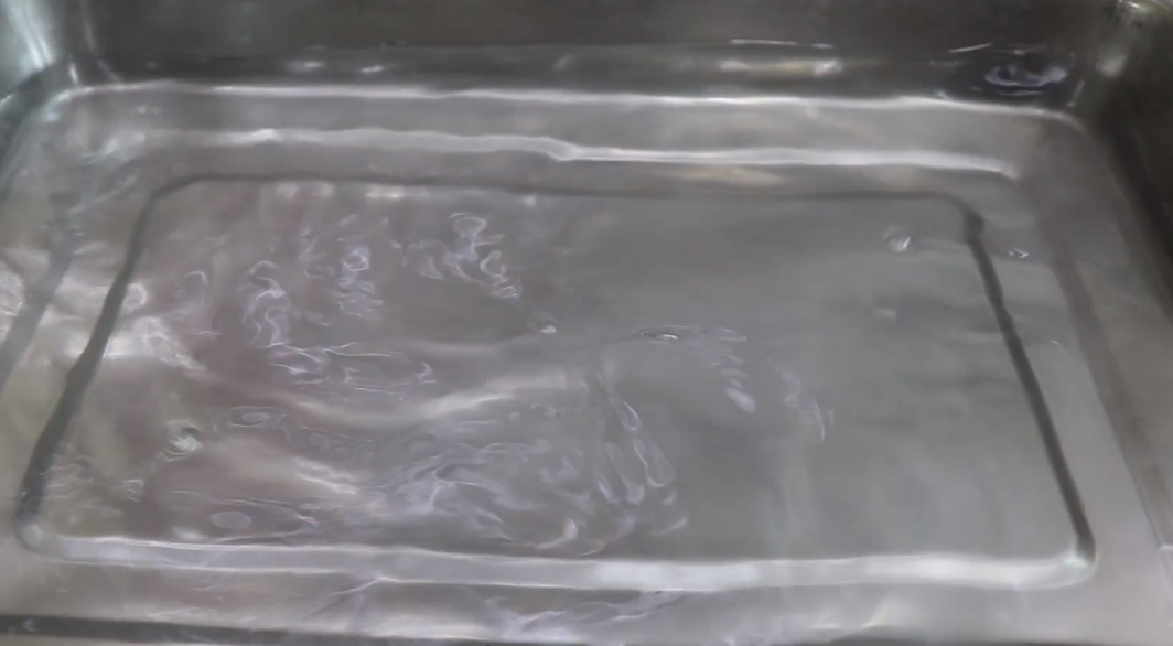 3.溶解好的冰粉粉,我們將其倒在一個無油無水的盒子里,沒有盒子的可以放在一個平整的水餃盤中。將其自然放涼備用。大家也可以放在冰箱的冷藏室冷藏四個小時就可以了。