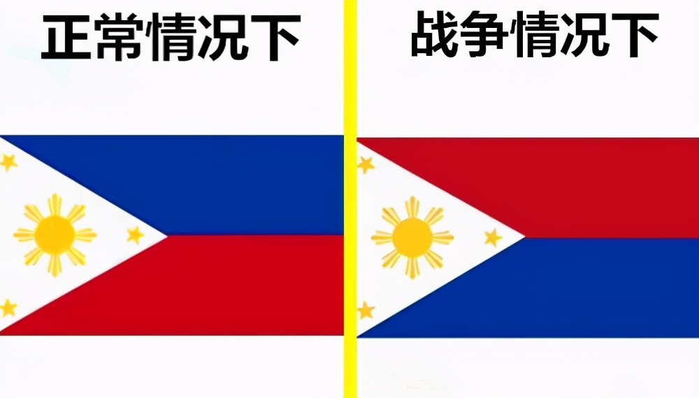 4.菲律賓的國旗會根據戰爭而發生變化。一般來講,在正常情況下,菲律賓國旗上方為藍色,下方為紅色;而如果發生戰爭,兩個顏色就會發生調換,寓意著“菲律賓進入戰爭狀態,需要民眾拿出勇氣對抗敵人”。