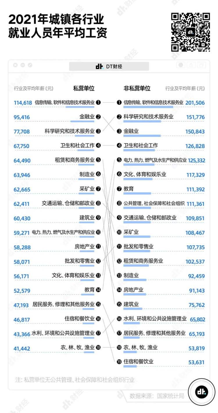 數據顯示,2021年,我國城鎮非私營單位年平均工資是10.7萬元,而私營單位年平均工資只有6.3萬元。換算成稅前月收入,2021年城鎮非私營單位平均每月稅前工資是8916元,私營單位則是5250元。