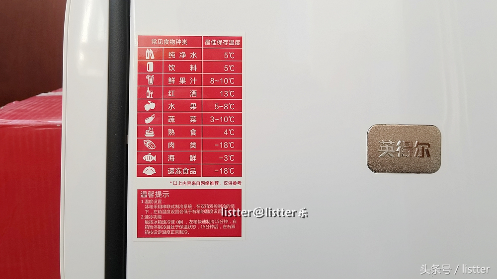 屏幕顯示方式是在按下按鈕后顯示期望要調教的溫度,大約2秒過后系統會顯示出當前箱體內的溫度,不用看說明書也能明白,設計也非常科學人性化。在顯示屏中間位置一個雪花模樣的按鈕則是“速冷”模式開關,打開這個開關箱體內制冷速度加快,但是也能明顯感到功耗增加,風扇聲音也加大。試了一下,在室溫23度的情況下,左箱從23度降到0度在十幾分鐘左右,速度也是很厲害了。不過在堆滿東西后制冷速度也要看具體情況了,我以前用過半導體制冷車載冰箱,明顯要感覺這款壓縮機制冷冰箱速度和噪音要更好。而且英得爾經過這么多年的技術積累,制冷噪音控制的非常理想。