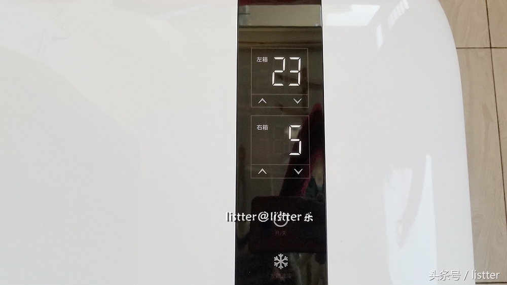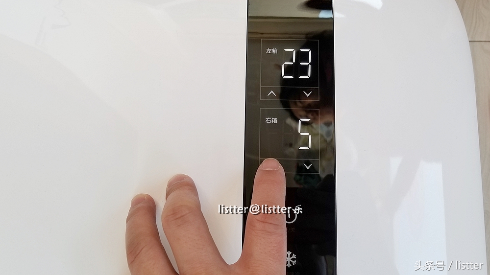 繼續來看顯示屏位置。T20的顯示屏非常漂亮,采用一體化觸控屏,息屏狀態下就是一條整體性非常好的黑色裝飾帶,通電后屏幕和控制按鈕亮起,數字區分為兩個部分,上下分別是左箱溫度和右箱溫度。可以通過數字底下的上下按鈕進行溫度的調節,步進為1℃,調教非常精準。