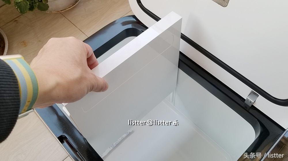 打開冰箱后可以看到蓋子上有一圈密封橡膠圈,起到保溫隔絕溫度的作用。中間一個隔板,起到左右箱體隔絕溫度的作用。