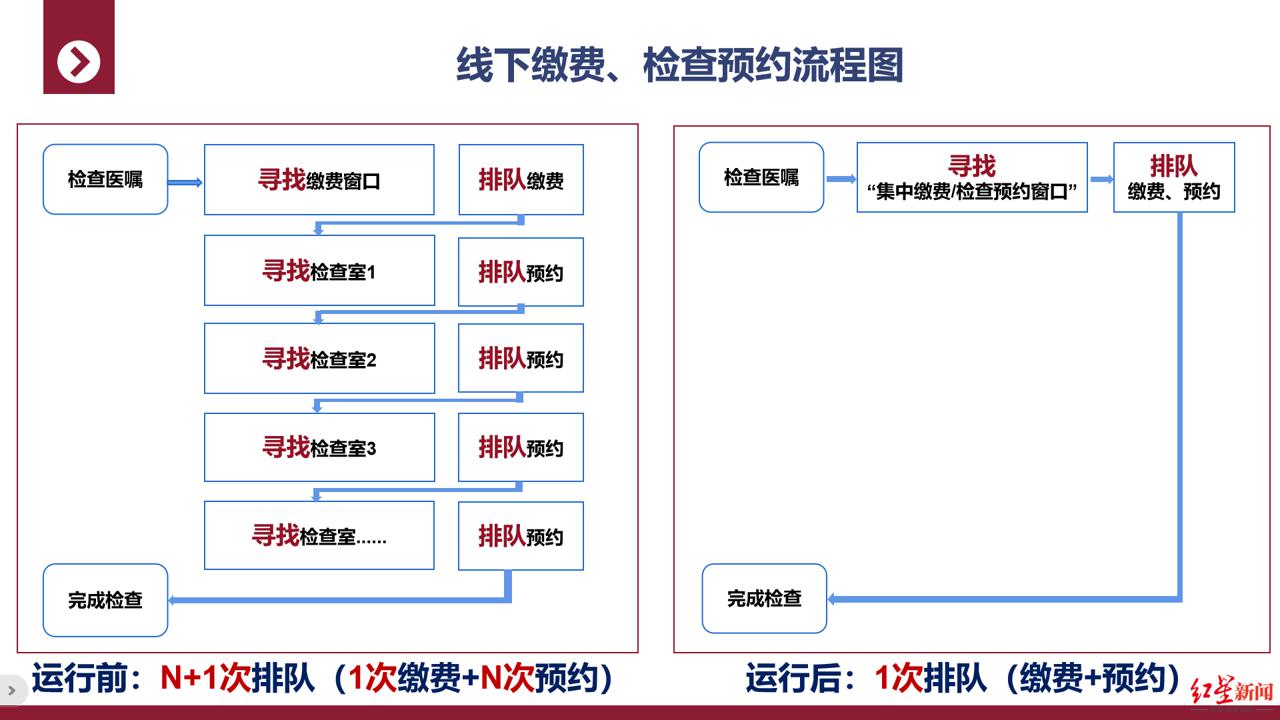 也就是說,以前需要先在收費窗口排隊交錢,然后去不同樓層的檢查預約窗口排隊預約,現在就在任何一個樓層的任何一個集中繳費/檢查集中預約窗口,就可以把繳費、所有的預約項目都完成。